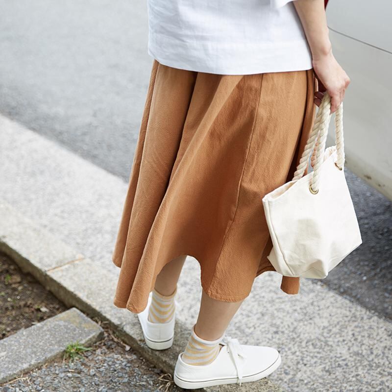 綿麻混の素材感がふんわりと生かされたディテールの膝下丈のロングフレアースカートです。