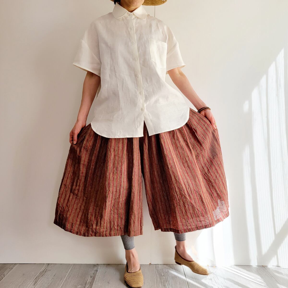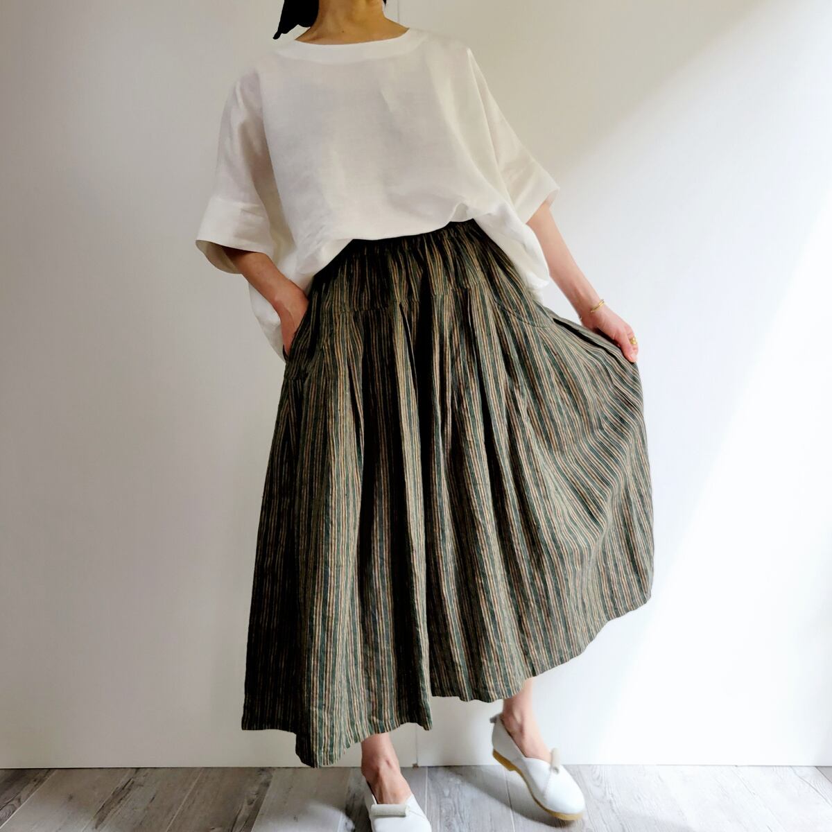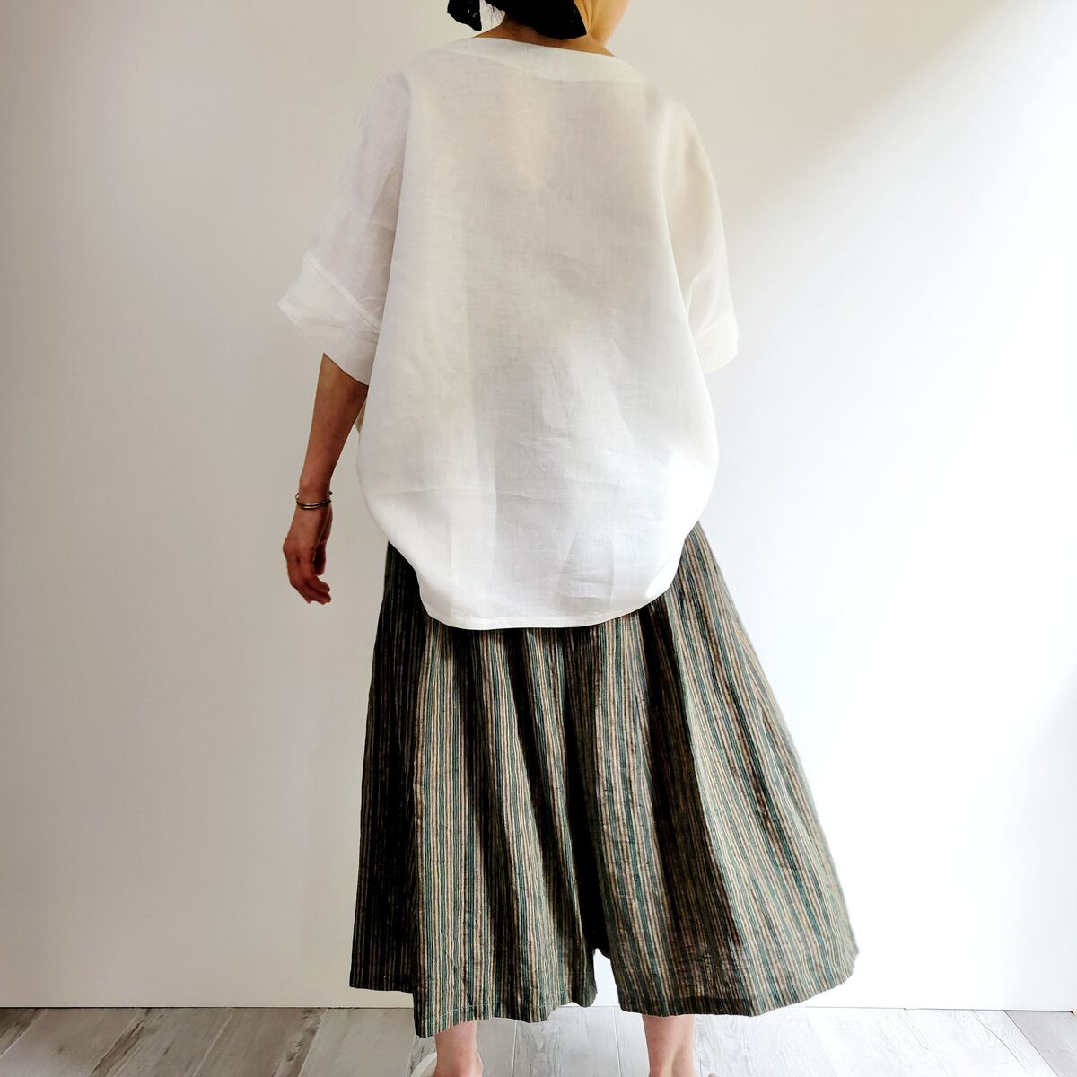 しっとり和を感じて年中コーデにも使える♪ リネンのストライプ柄キュロット グリーン